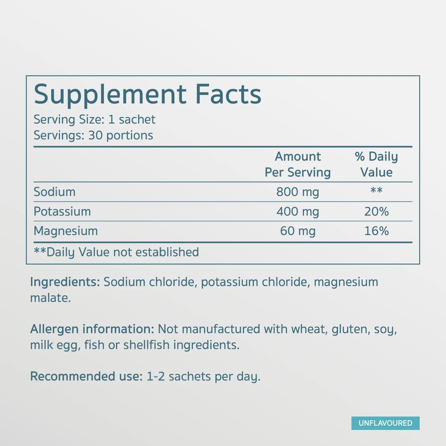 SALTE is an unflavoured electrolyte blend designed to restore what your body needs most, without unnecessary fillers. With a carefully balanced ratio of 800 mg sodium, 400 mg potassium, and 60 mg magnesium, SALTE supports optimal hydration and performance.